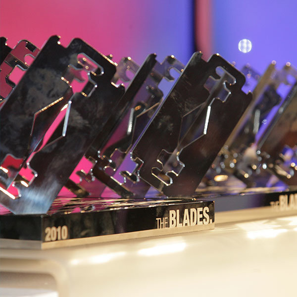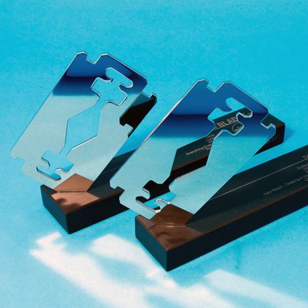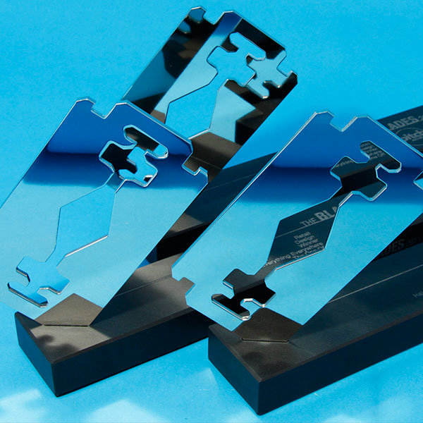 Distinctive creative advertising award featuring a pierced polished aluminium ‘blade’ combined with a black slate base.