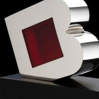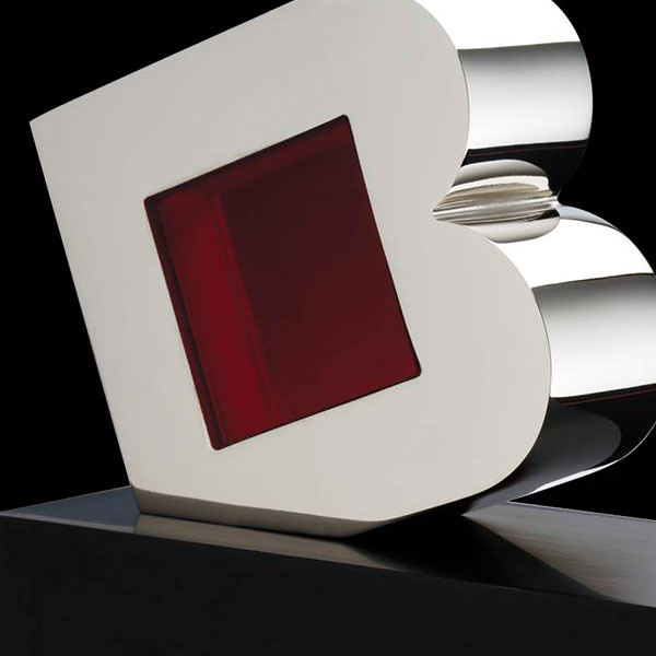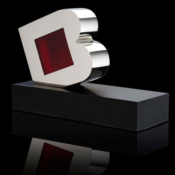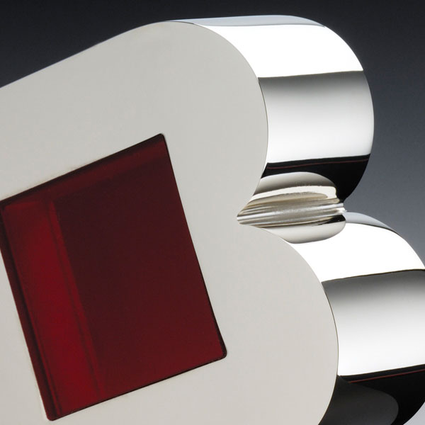 Black anodised aluminium base combined with a polished nickel plated aluminium and translucent red acrylic top to form this stunning bespoke award.