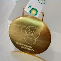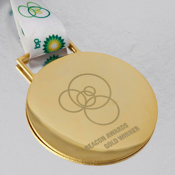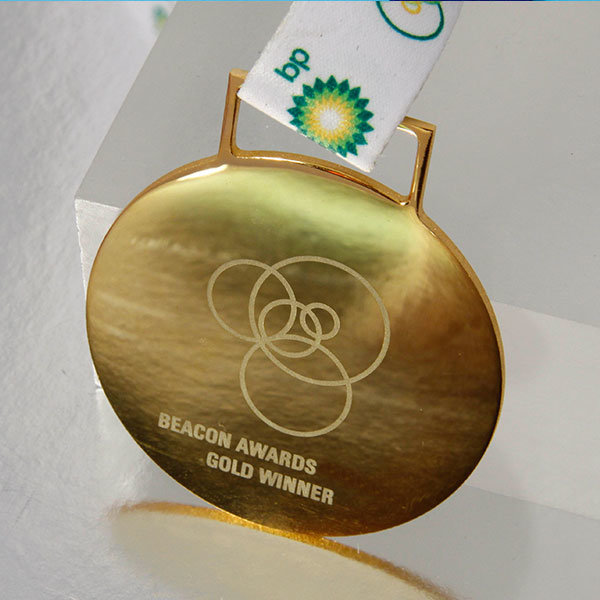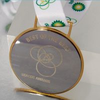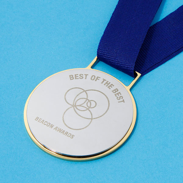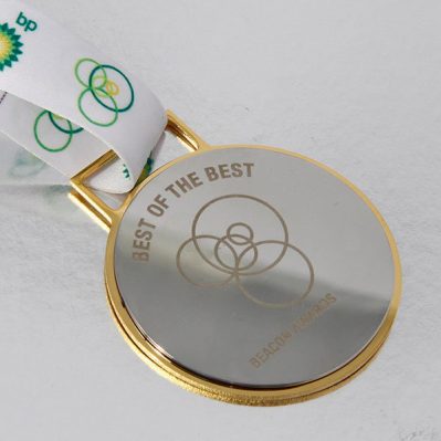 Pierced gold medal with bespoke branded ribbon. The best of the best medal includes a polished silver plate with engraved detail.