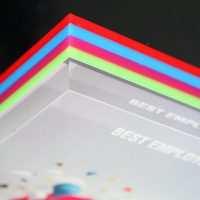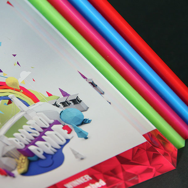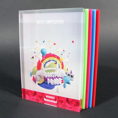 Stunning laminated acrylic award made with clear acrylic to the front, backed with vibrant acrylic, layered to form an eye-catching trophy.