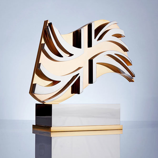 Intricately pierced gold, rose gold and nickel plated aluminium award.