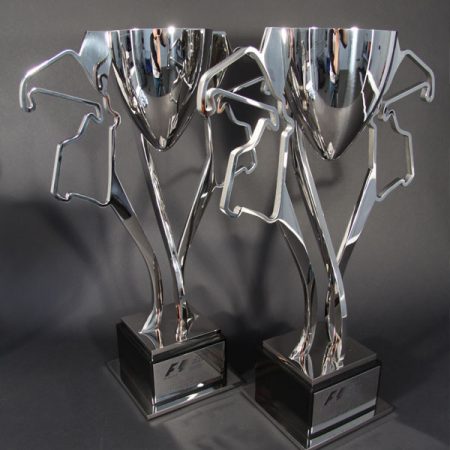The British Grand Prix, a race in the calendar of the FIA Formula One World Championship, is currently held at the Silverstone circuit. The shape of the circuit inspired the distinctive handles on this bespoke cup design.