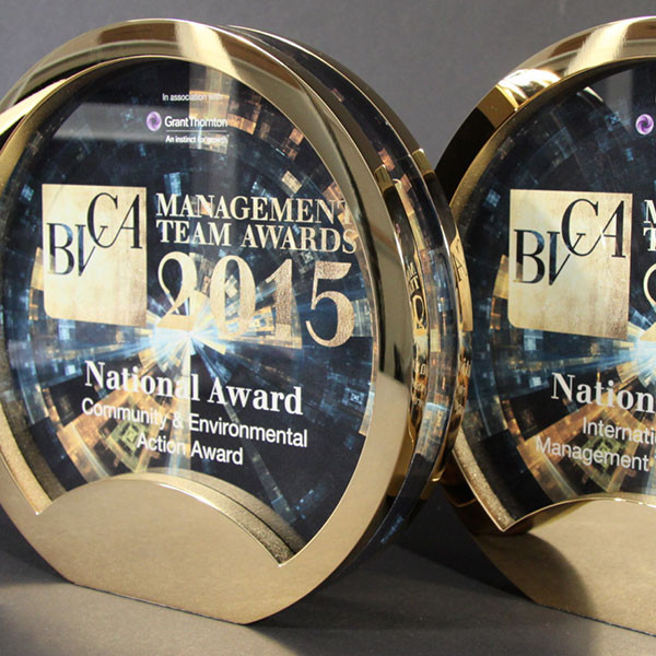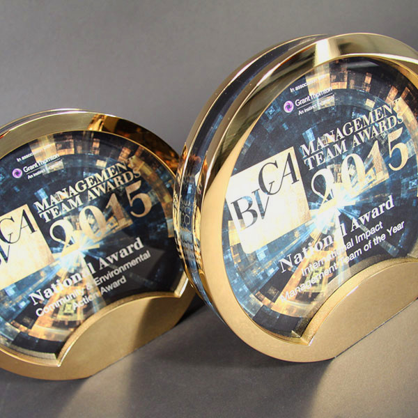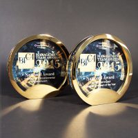 Distictive layered polished gold plated aluminium award with full colour printed clear acrylic.