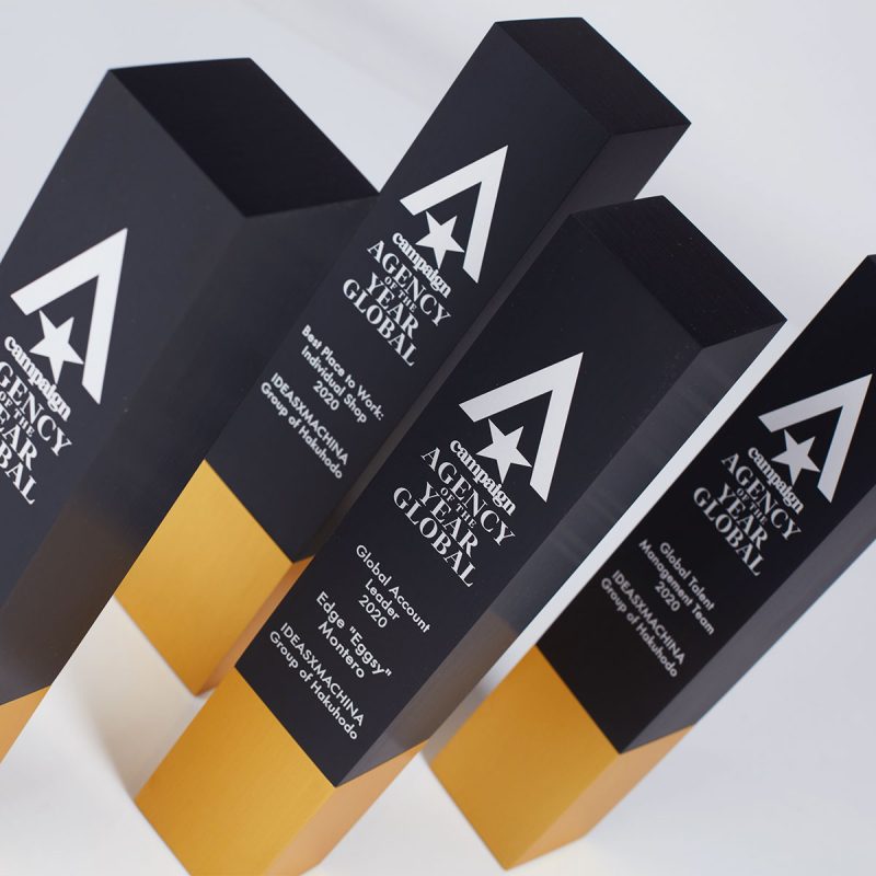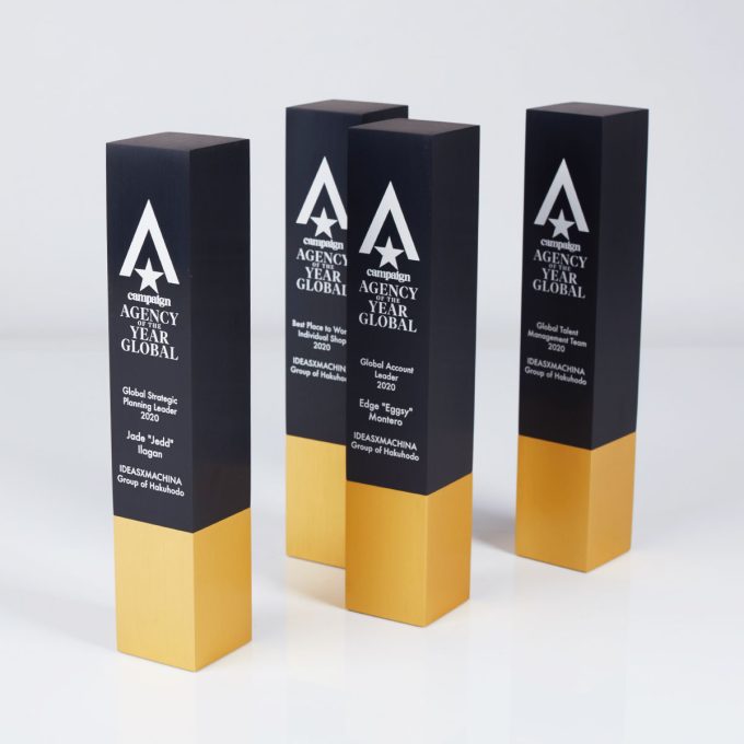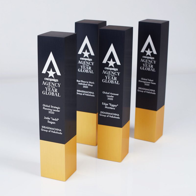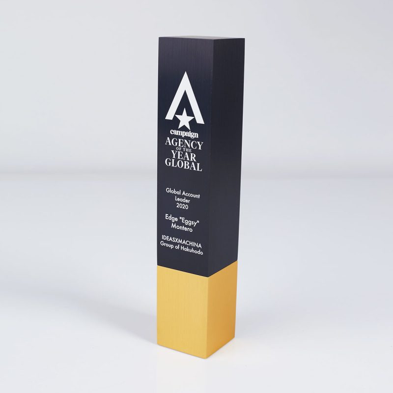 Eye-catching black and gold anodised award with digitally printed logo and laser engraved winner text