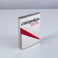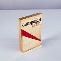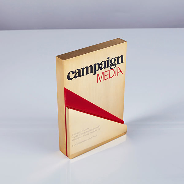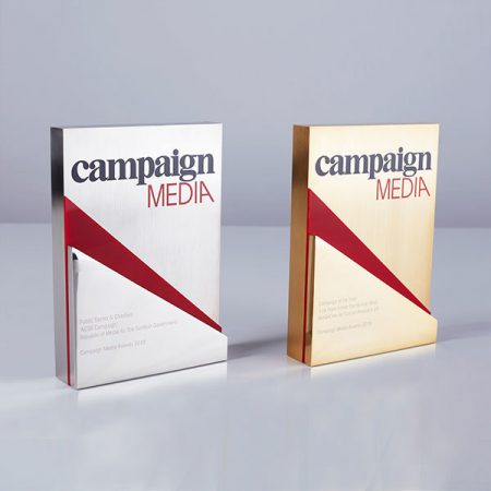 Glossy red acrylic and brushed nickel plated aluminium are combined to form this iconic award.