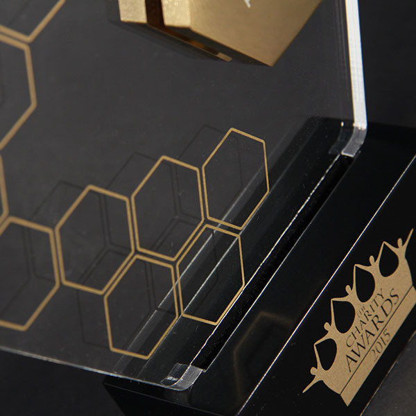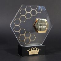 Distinctive laser cut acrylic award with gold print and polished gold plated aluminium hexagon layers. Fixed to a glossy black wood base.