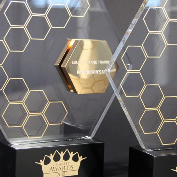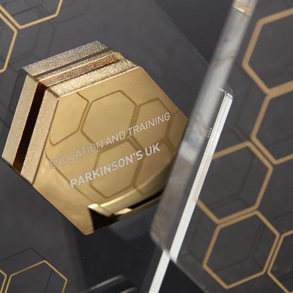 Each award is personalised by laser engraving directly onto the gold plated hexagon.
