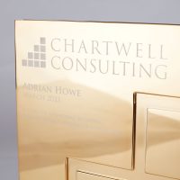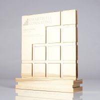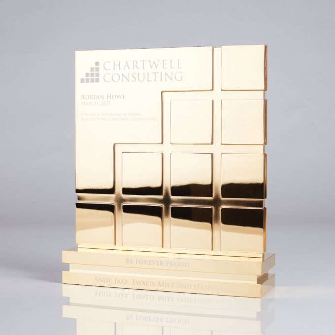 Gleaming gols plated award with machined line detail and laser engraved logo.