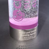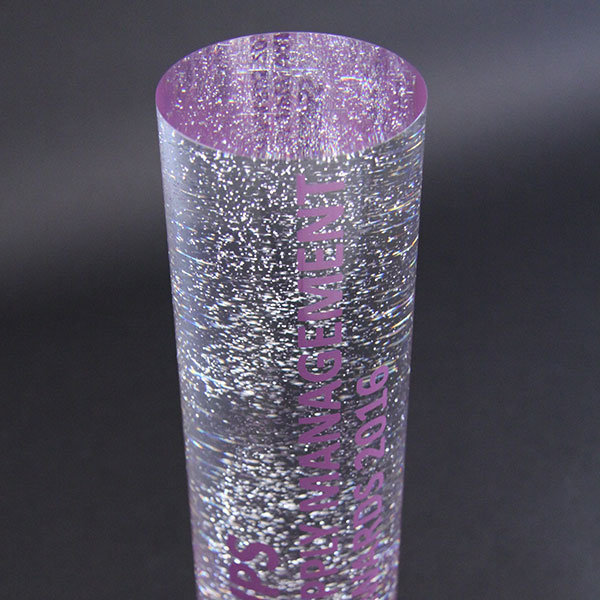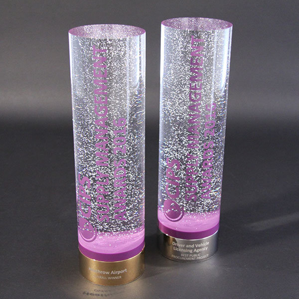 Stunning trophies featuring a suspension of silver glitter encased in a statuesque cylinder, digitally printed and standing on a nickel plated and acrylic podium. In total sixteen were made, one with gold decoration and fifteen in silver.