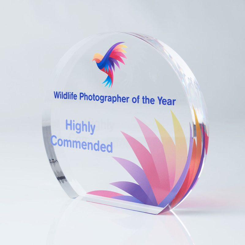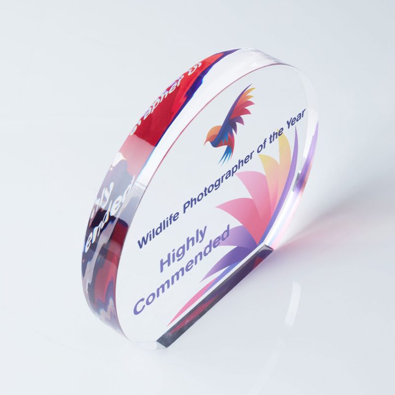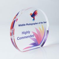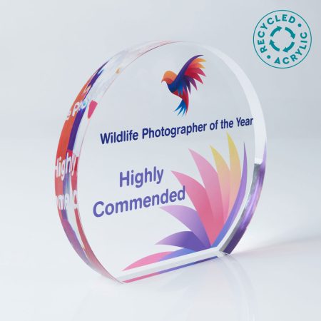 Circular award in 100% recycled acrylic. H160mm x W180mm x D25mm