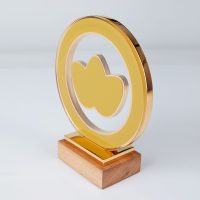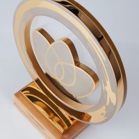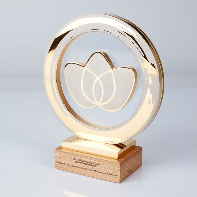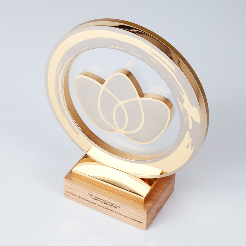 Gold plated award featuring Climate Challenge Cup’s recognisable logo, made in 70% recycled aluminium, and floating in recycled acrylic. A solid weighty wooden base represents the strong foundations and community spirit. Then printed acrylic adds the detailed finishing touches.