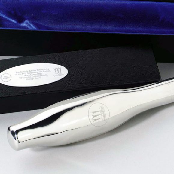 A limited edition replica baton made in pewter to commemorate the commonwealth games. The baton has a compartment within the handle that contains a transcript of the Queen’s Opening Ceremony message.