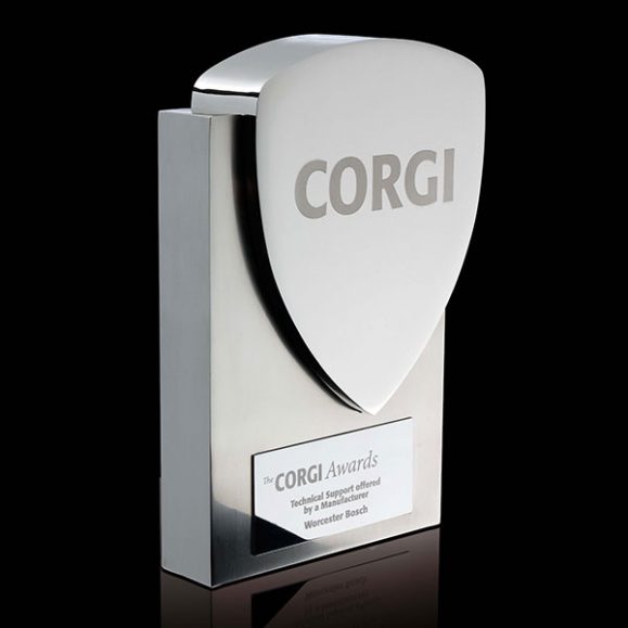 Profiled shield award in contrasting polished and brushed nickel plated aluminium.