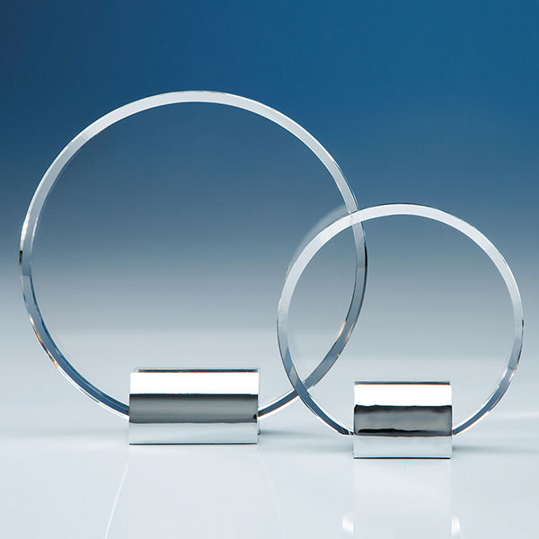 Elegant and very effective, the Circle awards are made out of perfectly clear optical crystal and mounted onto a chrome plated base to create an exquisite recognition, achievement or incentive gift. This exciting new range of awards can be personalised with any crest, logo or wording to create an award that is sure to take pride of place when put on display at home or at work. They are supplied in a black foam lined presentation box.
