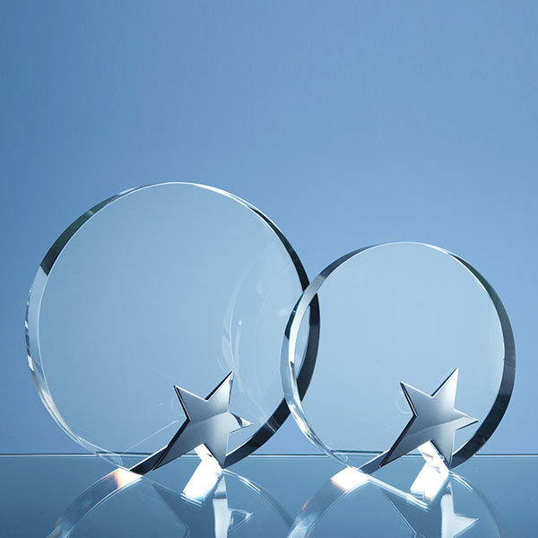 The circle award is simple in design but very stylish, it is hand crafted out of perfectly clear optical crystal and has a silver plated star bonded to the front to make an award well worth winning.