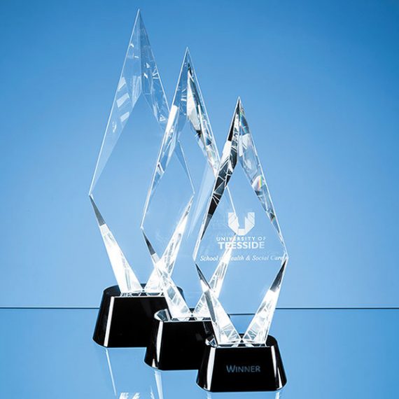 The peak of achievement! This eye-catching and impressive award, in flawless clear diamond shaped optical crystal with highly polished faceted sides and mounted on an onyx black crystal base is perfect to recognise the highest achievement. Available in three sizes, 28.5cm, 33.5cm and 38.5cm (shown). It is ideal to use as a standalone presentation, recognition or award, but also for 1st, 2nd and 3rd place achievement whether, sporting, academic or corporate. With a generous area to engrave a crest, company logo or message, it comes in its own foam lined presentation box.