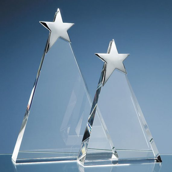 Stylish and modern looking awards that perfectly combine a hand crafted optical crystal triangle with a silver plated star to make an award well worth winning. The triangles can be personalised with any crest, logo or wording to create an award that is sure to take pride of place when put on display at home or at work. They are ideal recognition, achievement or incentive gifts and are supplied in a black foam lined presentation box.