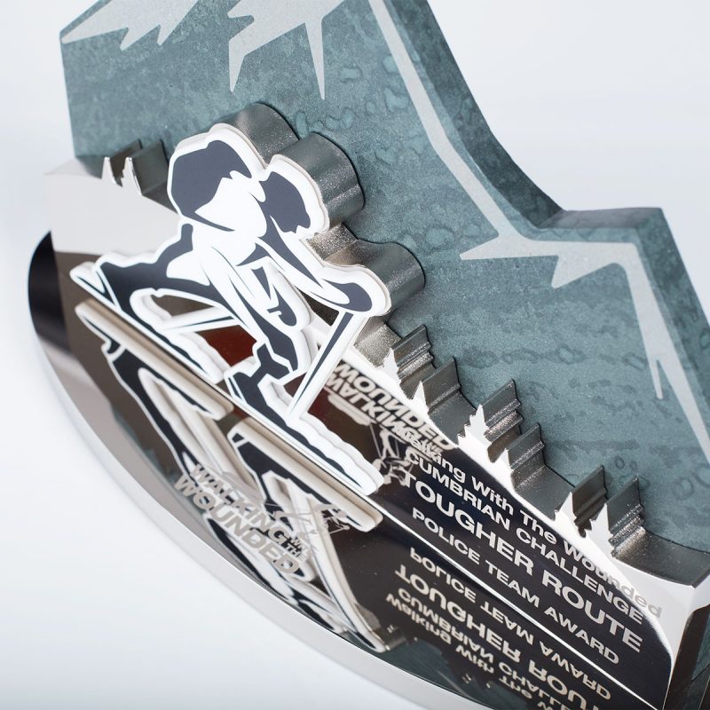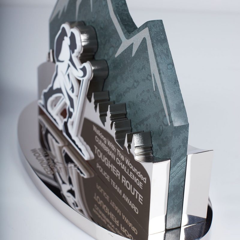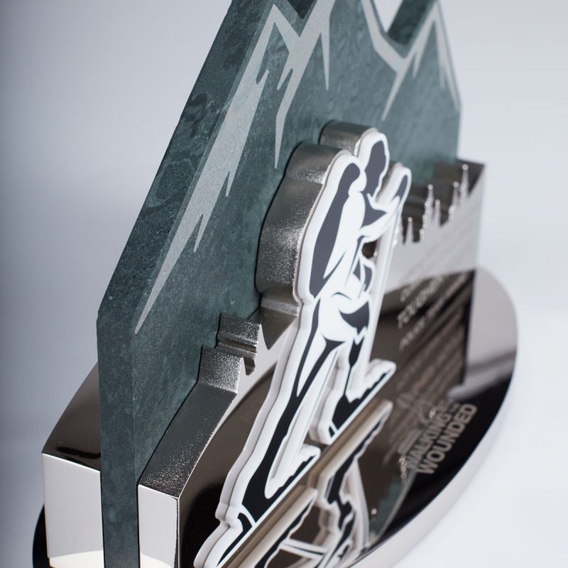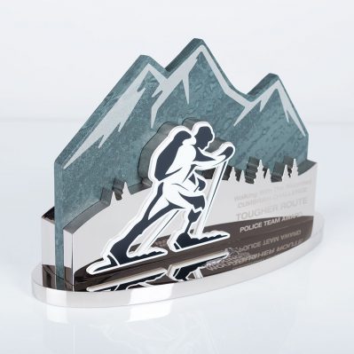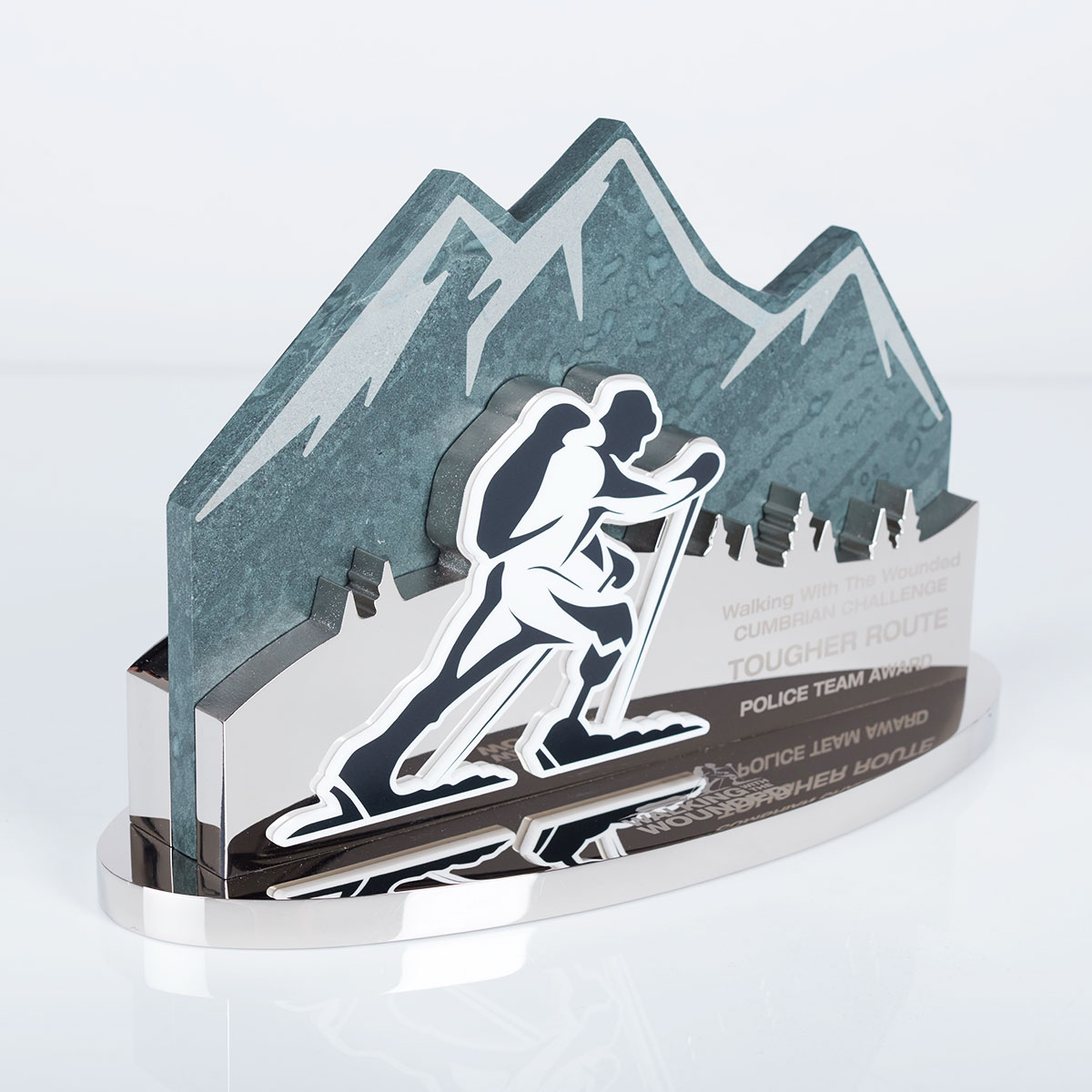 Slate and polished nickel plated aluminium award featuring a mountain and climber.