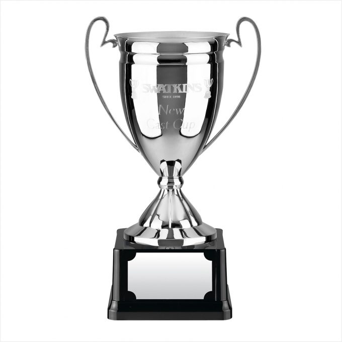 Nickel plated cup with curved handles and black plinth.