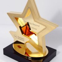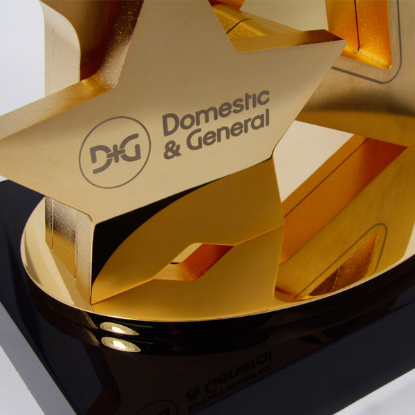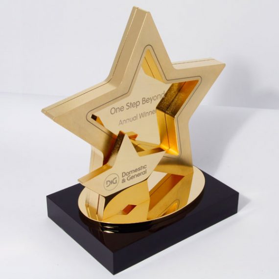 Distinctive polished gold plated aluminium award with waterjet pierced stars and black cast acrylic base.