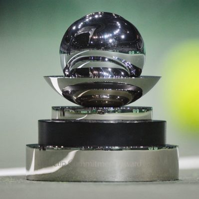 This custom-made and engraved trophy was designed by our in-house studio and is in the shape of a tennis ball resting in the Davis Cup trophy.