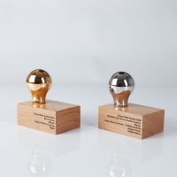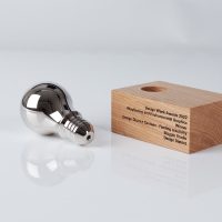 Beautifully turned aluminium light bulb plated in either gold or nickel. Displayed in a oak base with laser engraved winner detail.