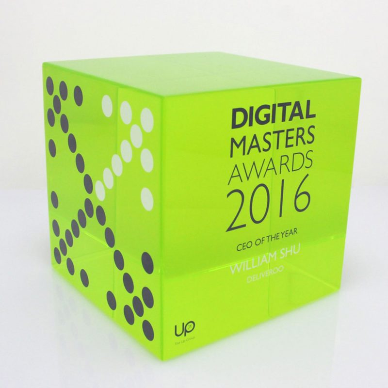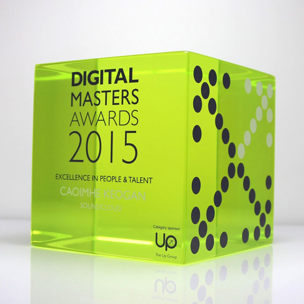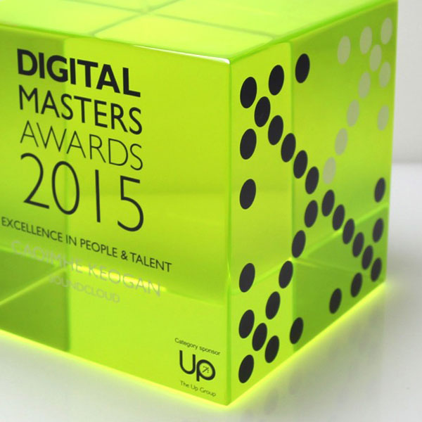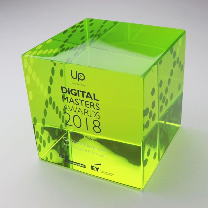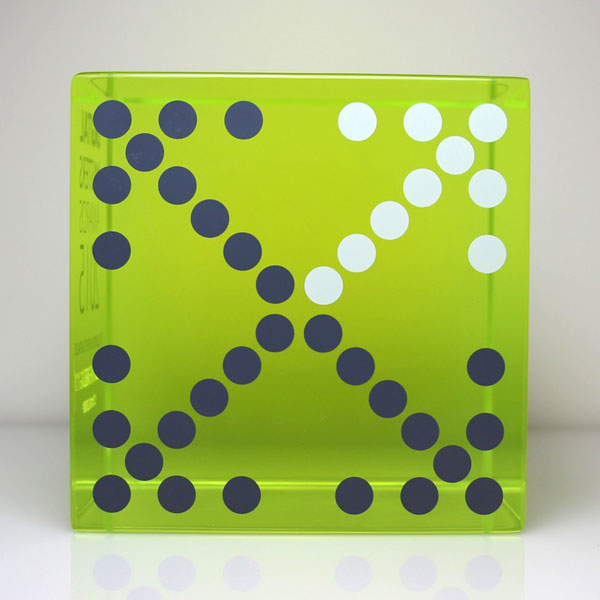 Stunning translucent green cast acrylic block with logo and pattern printed externally on 5 sides.
