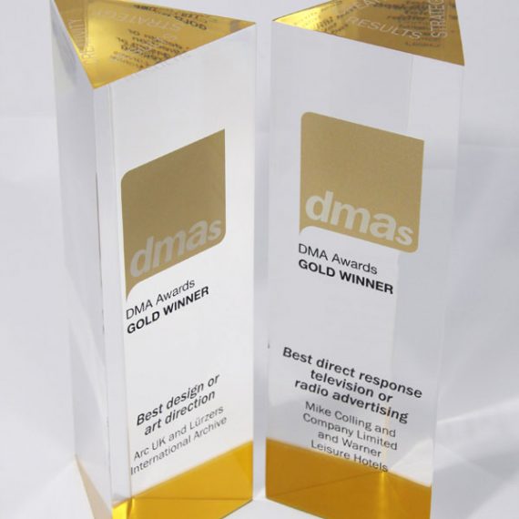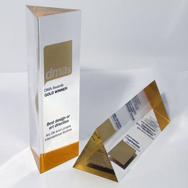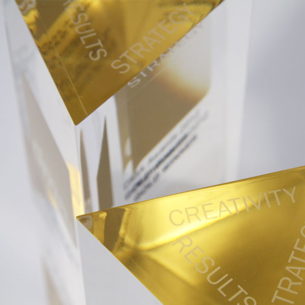 Unique 3 sided cast acrylic award with gold printed base and internally encapsulated printed logo and winner text.
