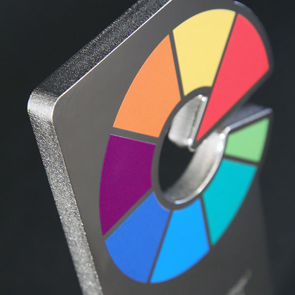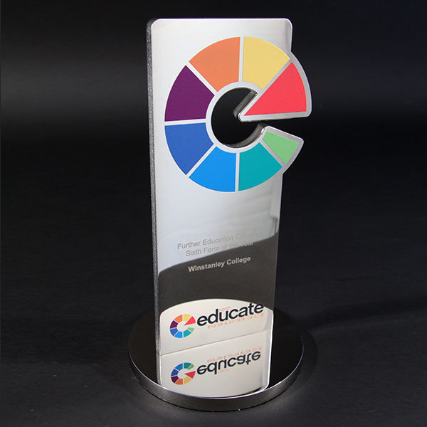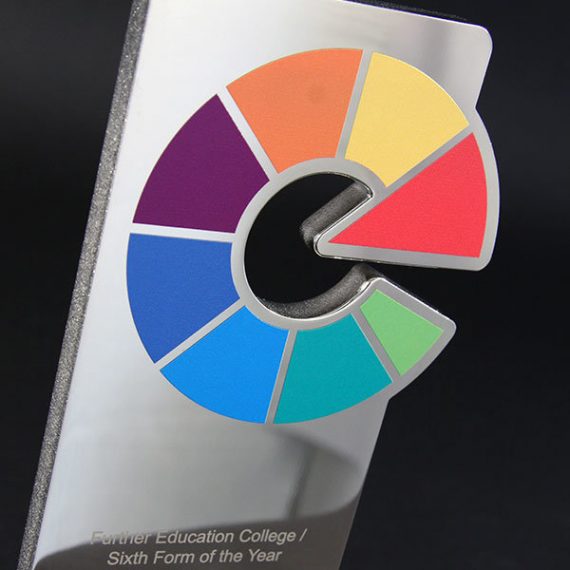 Vibrant bespoke award in polished nickel plated aluminium with a bold rainbow print.