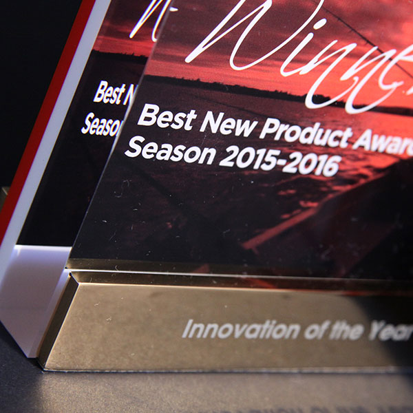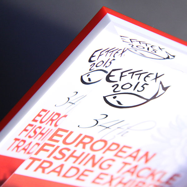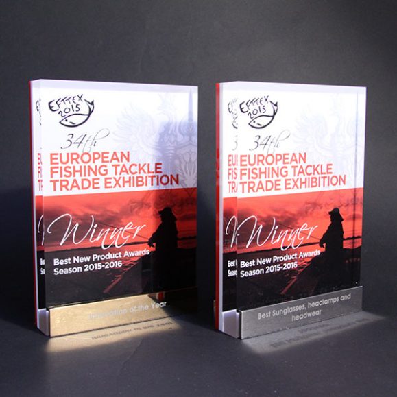 The European Fishing Tackle Trade Exhibition commissioned these stunning awards designed by Special EFX. The laminated acrylic award with eye-catching, colour print features a red acrylic backing combined with a polished nickel plated aluminium base.