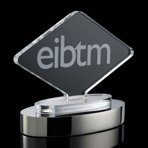 Stunning profiled glass trophy with sandblasted logo and mirror finish polished base.