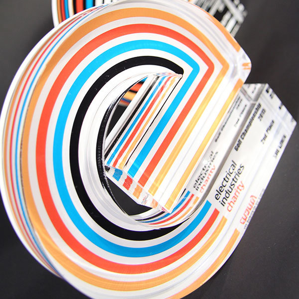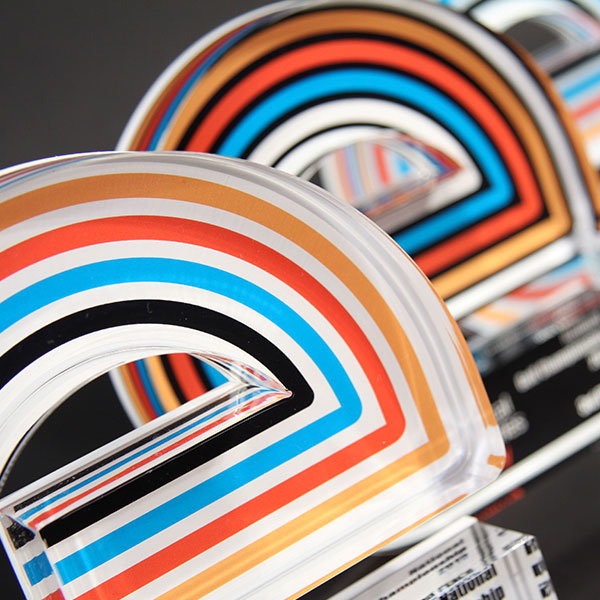 Distinctive layered profiled acrylic award with bold printed detail.