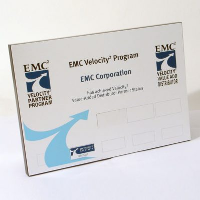 Polished nickel plated aluminium printed will full colour graphics and combined with black wood to form an impressive bespoke plaque.
