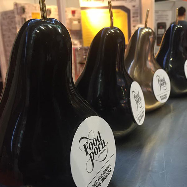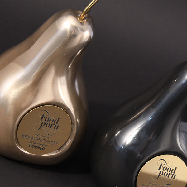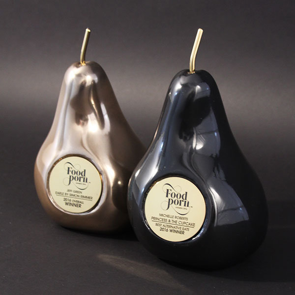 The Food Porn Awards are a celebration of beautiful looking food…and nothing else! The cheeky, pear awards are manufactured in black and bronze cast resin, each one was then printed on a gold plate. Suitably delicious!
