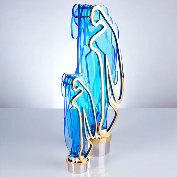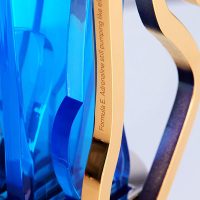 Stunning acrylic and aluminium trophy. Each circuit was specially cast in translucent blue acrylic then meticulously profiled, precision-cut and fixed together using 14 gold plated raisers. Combined with a multi-layered base design.