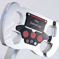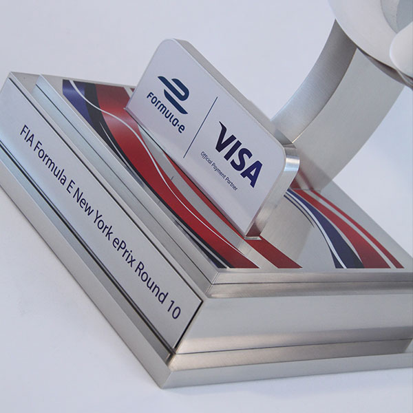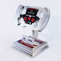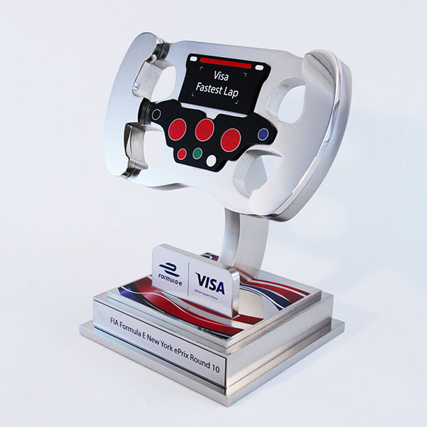 Impressive trophy manufactured using layers of polished and brushed aluminium to form the steering wheel shape. Complete with printed detail.