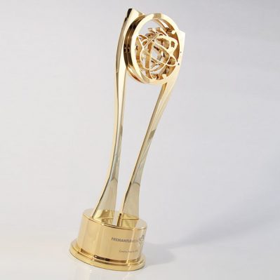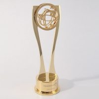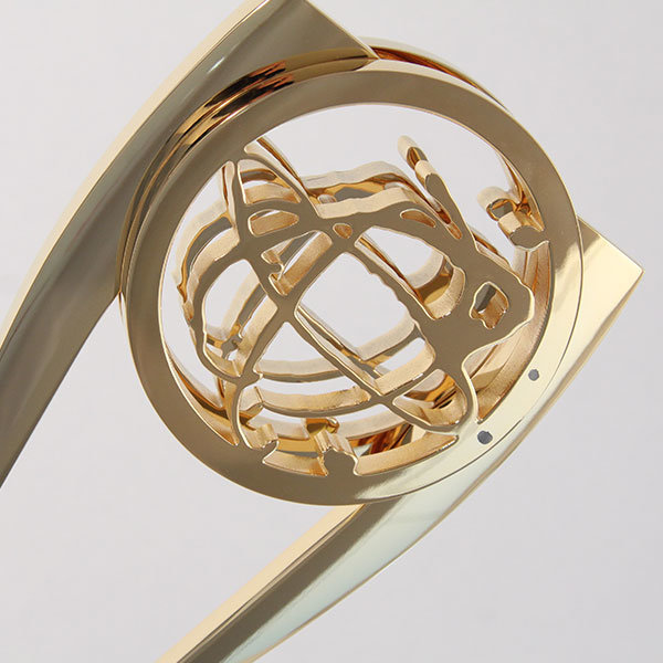 Stunning gold plated trophy with intricately pierced logo detail and laser engraved cylindrical base.