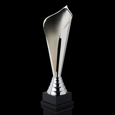 Handcrafted silver plated cup in a furled shape and wooden base.