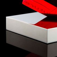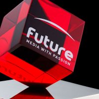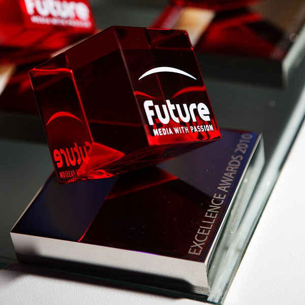 Translucent red acrylic cube with bold print is combined with dazzling mirror-finished nickel plate to form an striking bespoke award.