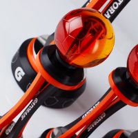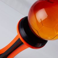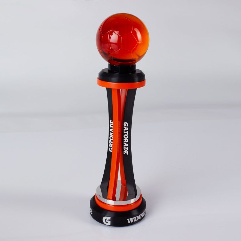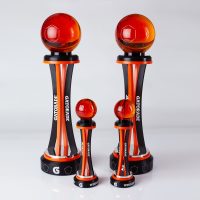 Imposing trophy manufactured in aluminium with an orange painted and black anodised finish. Topped with a cast acrylic ball.
