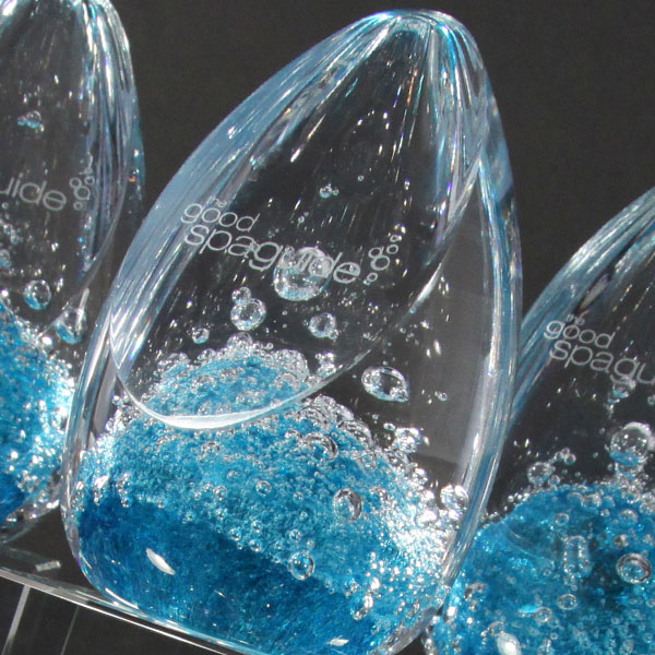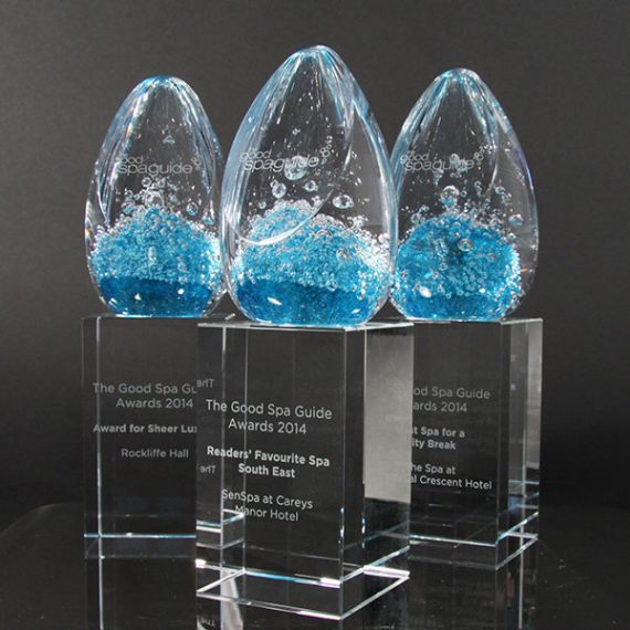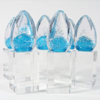 This contemporary design features effervescent blue bubbles inside a glass tear drop, standing on a glass base.