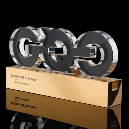 This high profile award combines hand polished gold plated aluminium with laser cut clear acrylic to form an impressive prize.