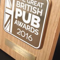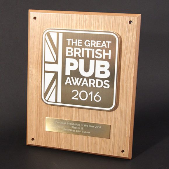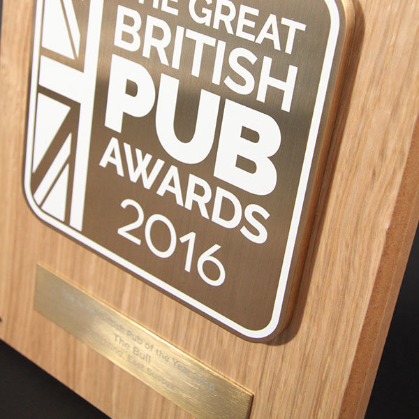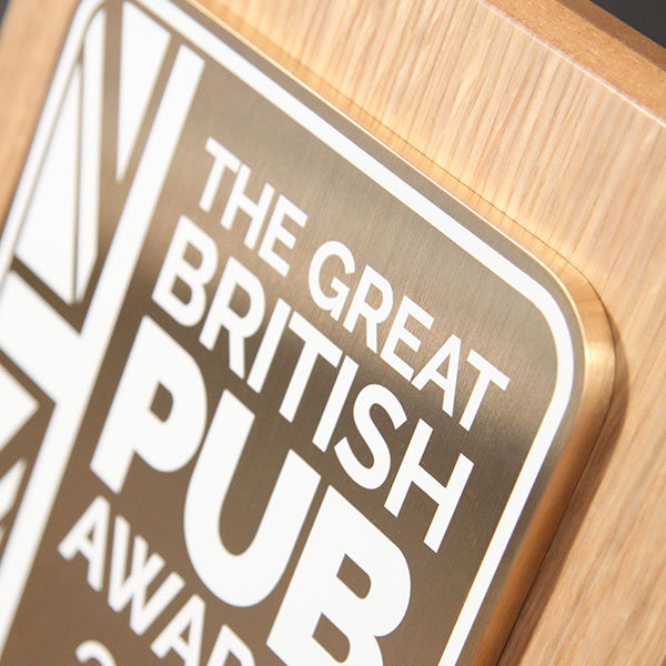 An update of a previous design this plaque features a bevelled wood backing with brushed gold plated aluminium and a bold printed logo.