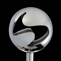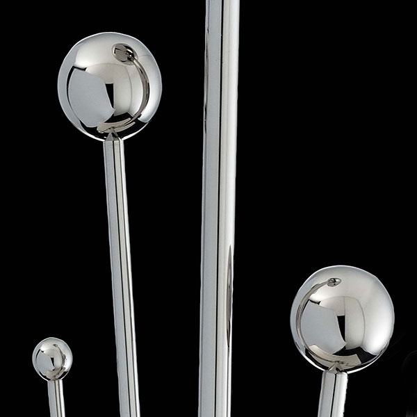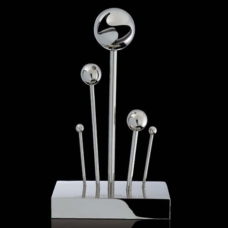 Manufactured using a large pierced sphere with smaller spheres suspended on rods above a polished nickel plated aluminium base.