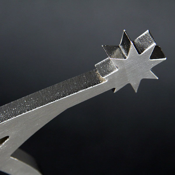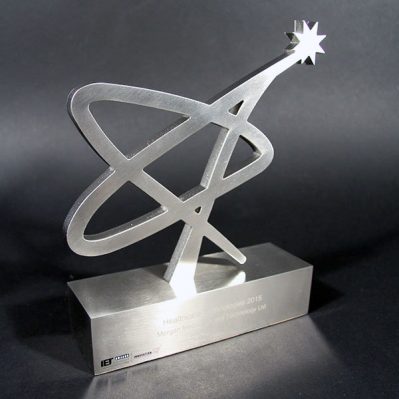 Intricately pierced brushed aluminium trophy with laser engraved and printed winners’ details.