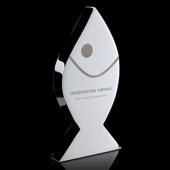 Bespoke free-standing Fish Award profiled from polished nickel aluminium with laser engraved detail.