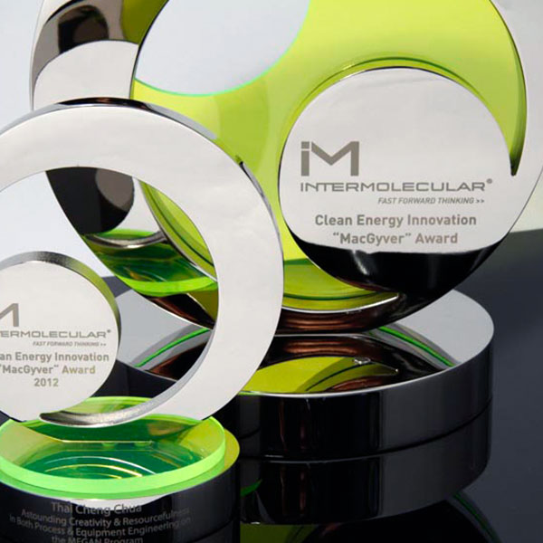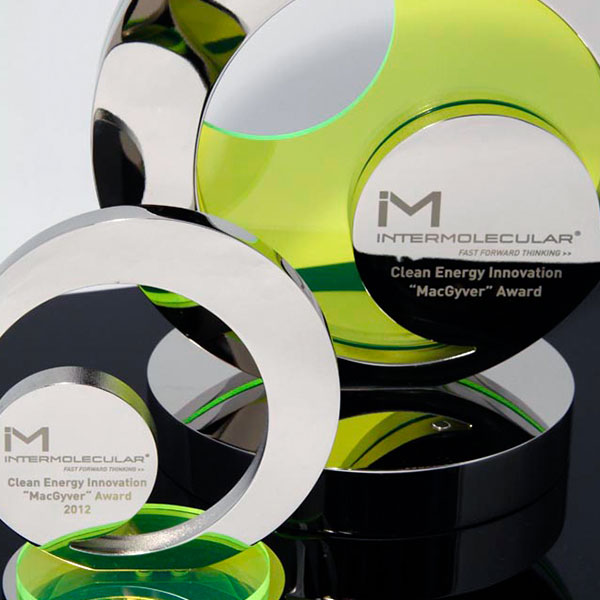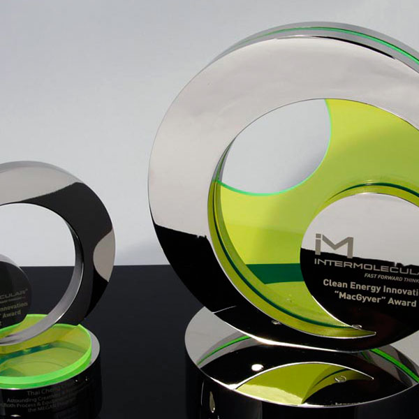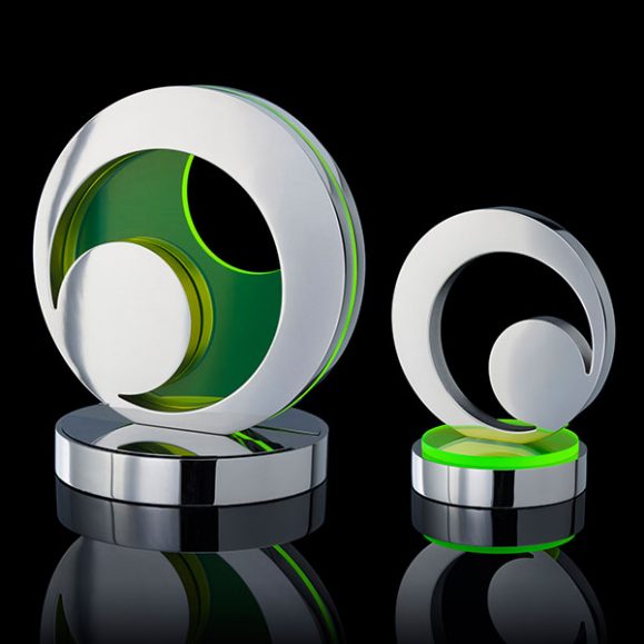 Fluorescent edge-lit acrylic combined with mirror-finished nickel plate to form a stunning bespoke award.