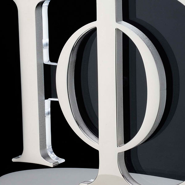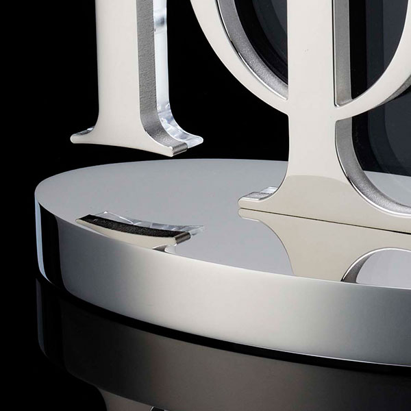 Polished nickel plated aluminium combined with clear acrylic to form a clever ‘floating’ effect.
