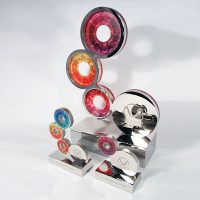 Designed by the EFX studio the shape reflects a contemporary take on a tennis ball, stylised with boldly coloured acrylic disks, each sporting a central hole.