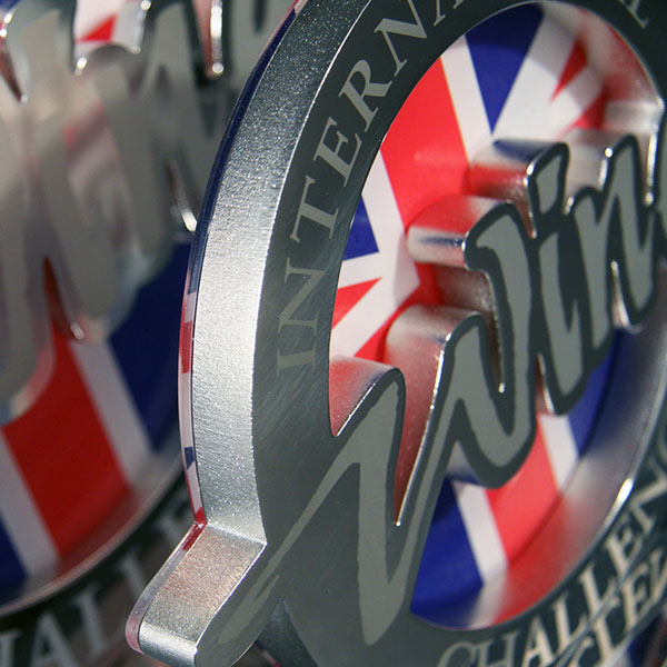 Stunning trophy combining layered polished nickel plated aluminium with full colour printed acrylic to great effect.